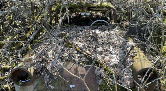 Sönderkörda Nissan-Bluebird letas av legitimerad bilskrot i Lilla Edet för demontering. De reservdelar som bedöms ha någon livslängd kvar återanvänds för avyttring.